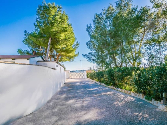 De villa te koop in Moraira bevindt zich op een vlak perceel met grote terrassen, tuinen en parkeergelegenheid.