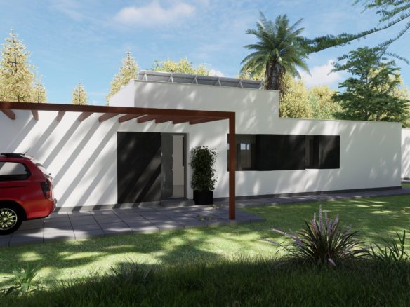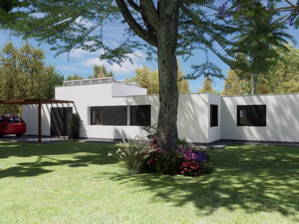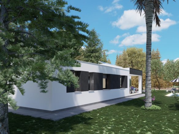 Rondom het huis is de buitenvloer voorzien van geprint beton, wat het moderne karakter van de woning versterkt.