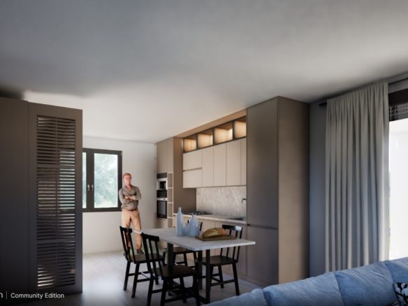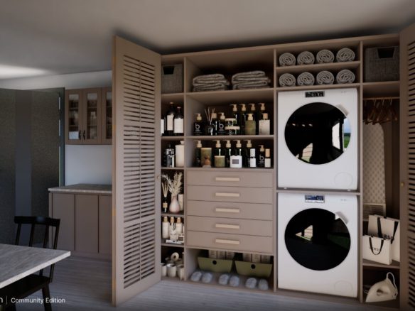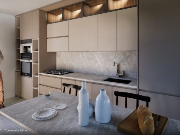 De keuken is uitgerust met boven- en onderkasten, en het werkblad is van het type “Silestone” of vergelijkbaar. Een roestvrijstalen spoelbak wordt geïnstalleerd, evenals de voorbereidingen voor een wasmachine en droger.